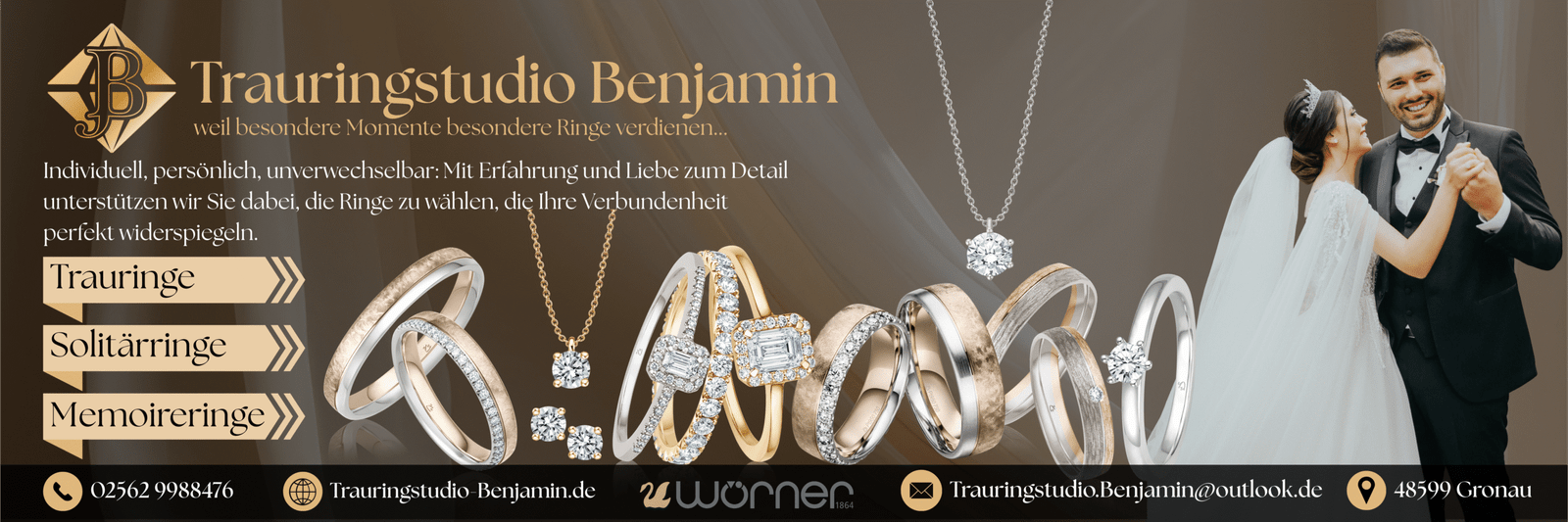 For Trauringstudio Benjamin, we designed a high-quality advertising banner that perfectly showcases the uniqueness and emotional value of the jewelry pieces offered. The design combines elegant typography with refined gold and brown tones, creating a visual connection between luxury and warmth.