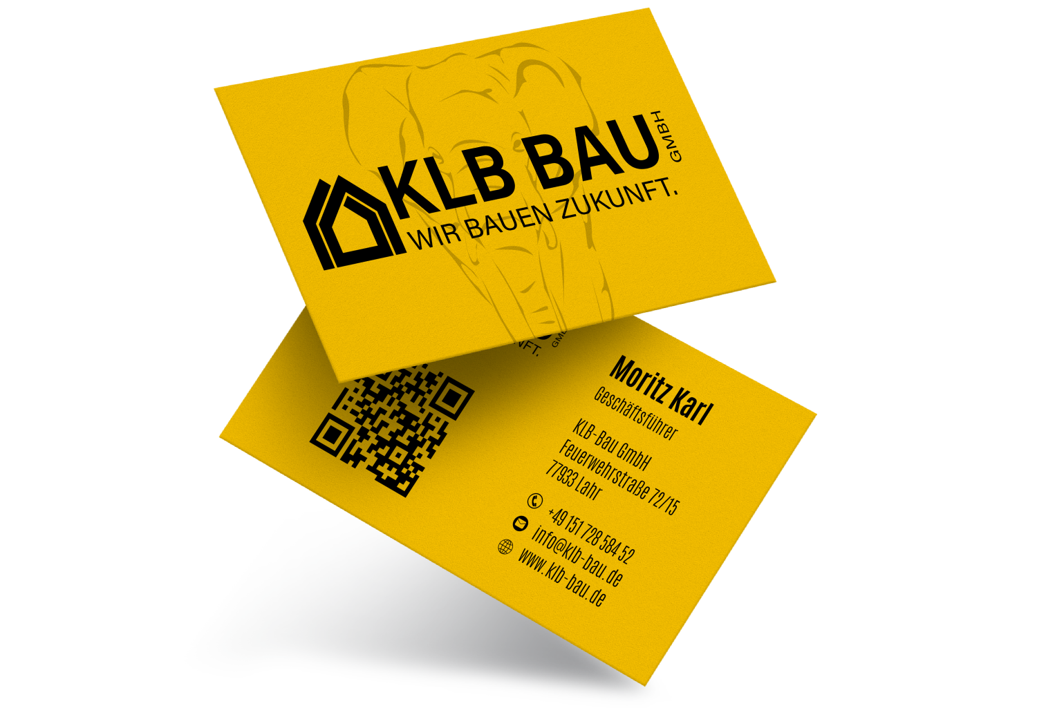 Die Visitenkarten für die KLB Bau GmbH, überzeugen durch ein kraftvolles und modernes Erscheinungsbild. Das markante Gelb in Kombination mit schwarzer Typografie sorgt für eine hohe Wiedererkennbarkeit und spiegelt Stärke, Zuverlässigkeit und Handwerksqualität wider.Die Vorderseite präsentiert das Logo mit Haus-Icon und dem prägnanten Slogan „Wir bauen Zukunft.“, während die Rückseite klar strukturiert alle relevanten Kontaktdaten sowie einen QR-Code für den schnellen digitalen Zugriff enthält. Das reduzierte, professionelle Layout unterstreicht die Kompetenz der KLB Bau GmbH und hinterlässt einen nachhaltigen, seriösen Eindruck bei Kunden und Geschäftspartnern.